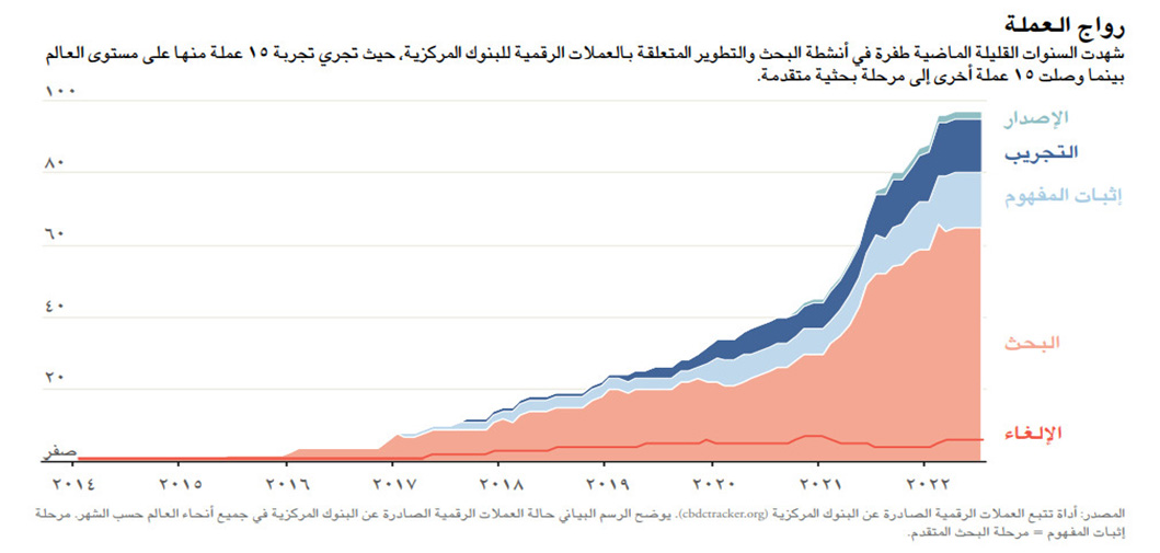 وقد أشار المجلس الأطلسي إلى أن (130) دولة، تمثل أكثر من (98%) من الناتج المحلي الإجمالي العالمي، تدرس حاليًا تقديم عملاتها الرقمية من خلال بنوكها المركزية. وقد أطلقت (11) دولة عملاتها الرقمية بشكل كامل، ومن المقرر أن يتوسع الإصدار التجريبي الصيني ليشمل الدولة بأكملها في عام 2023م، هذا وتعتبر جاميكا أحدث دولة أطلقت عملتها الرقمية للبنك المركزي. وفي عام 2023م اتخذت أكثر من (20) دولة خطوات مهمة تجريبية نحو إطلاق عملاتها الرقمية. هذا وتعتزم أستراليا وتايلاند والبرازيل والهند وكوريا الجنوبية وروسيا مواصلة أو بدء الاختبار التجريبي في عام 2023م. ومن المرجح أيضًا أن يبدأ البنك المركزي الأوروبي تجربته العام المقبل. كما أن (18) دولة من دول مجموعة العشرين وصلت مراحل متقدمة من تطوير عملاتها الرقمية، في حين أن هناك (7) دول من المجموعة في مراحلها التجريبية. (1)