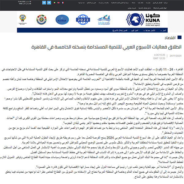 انطلاق فعاليات الأسبوع العربي للتنمية المستدامة بنسخته الخامسة في القاهرة - وكالة الأنباء الكويتية ( كونا)