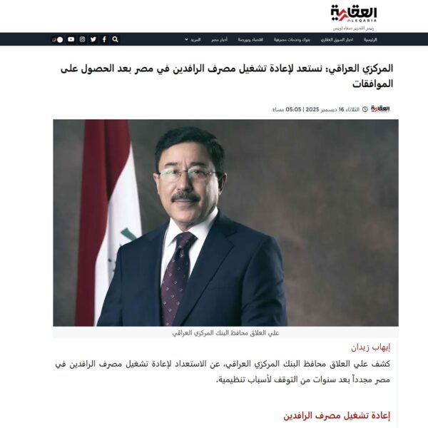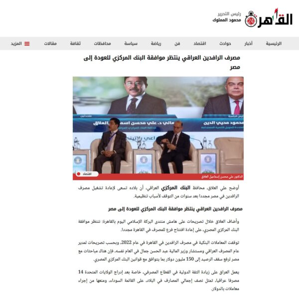 المركزي العراقي: نستعد لإعادة تشغيل مصرف الرافدين في مصر بعد الحصول على الموافقات