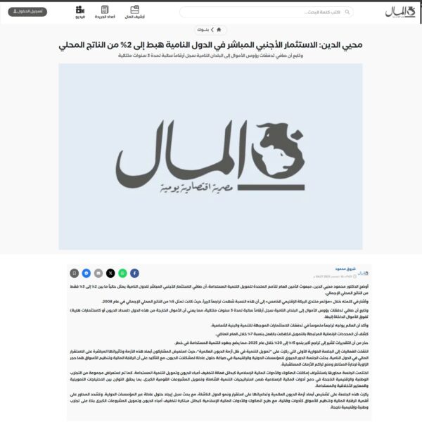 محيي الدين: الاستثمار الأجنبي المباشر في الدول النامية هبط إلى 2% من الناتج المحلي