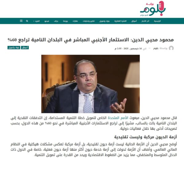 محمود محيي الدين: الاستثمار الأجنبي المباشر في البلدان النامية تراجع 60%