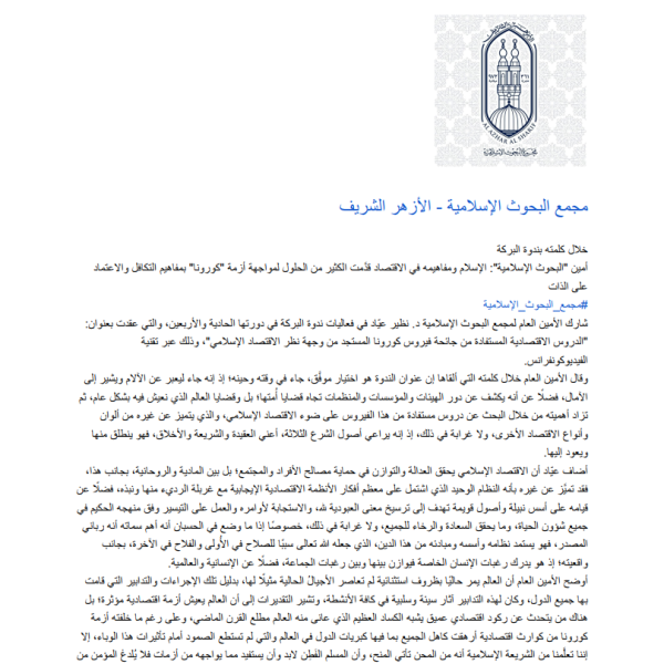 أمين البحوث الإسلامية: مفاهيم الإسلام في الاقتصاد قدَّمت الحلول لمواجهة كورونا - ندوة البركة 41 - القاهرة 24
