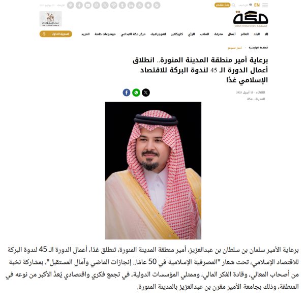 برعاية أمير منطقة المدينة المنورة.. انطلاق أعمال الدورة الـ 45 لندوة البركة للاقتصاد الإسلامي غدًا