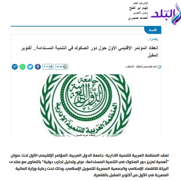 المؤتمر الإقليمي الأول أهمية تعزيز دور الصكوك في التنمية المستدامة أكتوبر القادم بالقاهرة