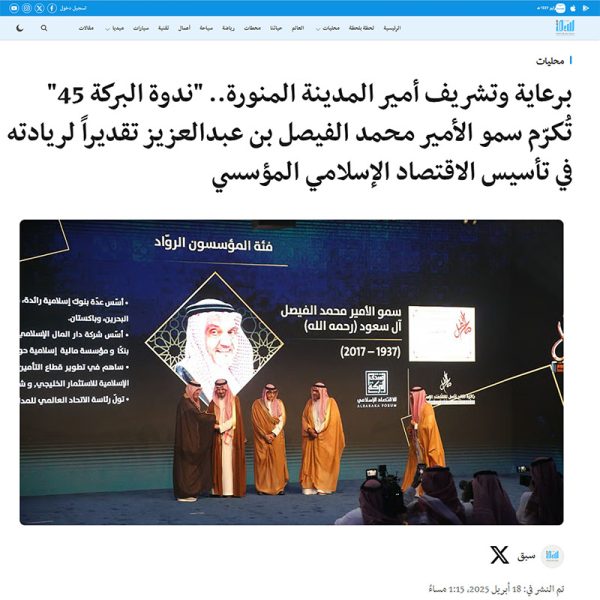 برعاية وتشريف أمير المدينة المنورة.. "ندوة البركة 45" تُكرّم سمو الأمير محمد الفيصل بن عبدالعزيز تقديراً لريادته في تأسيس الاقتصاد الإسلامي المؤسسي