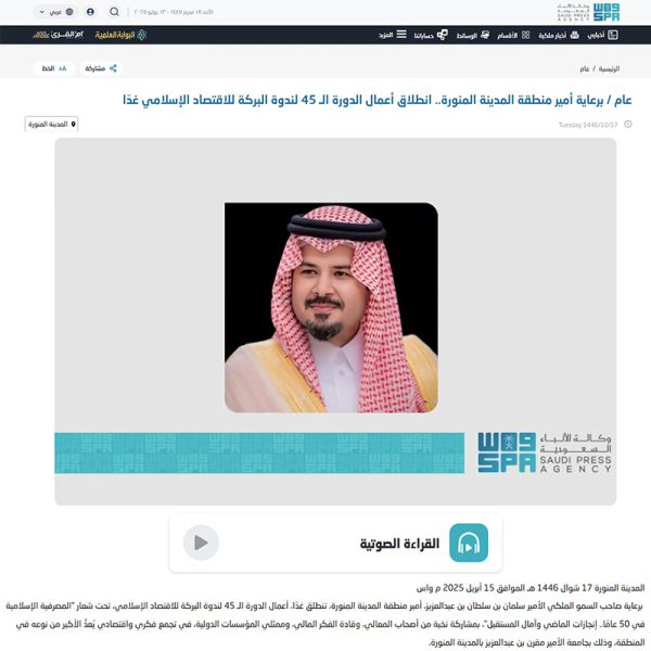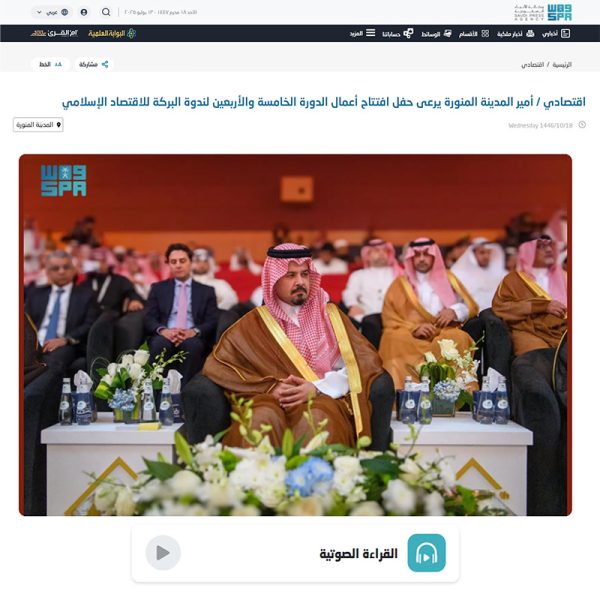 أمير المدينة المنورة يرعى حفل افتتاح أعمال الدورة الخامسة والأربعين لندوة البركة للاقتصاد الإسلامي